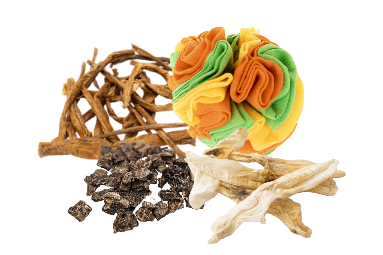 - Een snuffelbal (deze bal bevat veel plooien of holtes waar de snacks (trainers) of brokjes van jouw hond in verstopt kunnen worden)