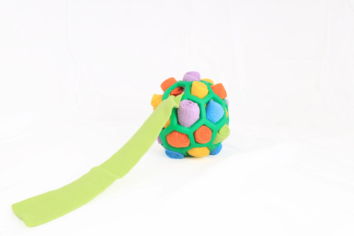 Maak snacken voor jouw hond een uitdagend en speels avontuur met deze unieke snuffelbal met linten. Tussen de zachte fleece linten kun je snacks (trainers) of brokjes verstoppen. Voor extra uitdaging kunnen de linten worden opgerold met snacks ertussen. Dit speelgoed stimuleert het natuurlijke zoekgedrag van je hond en zorgt voor mentale stimulatie.
