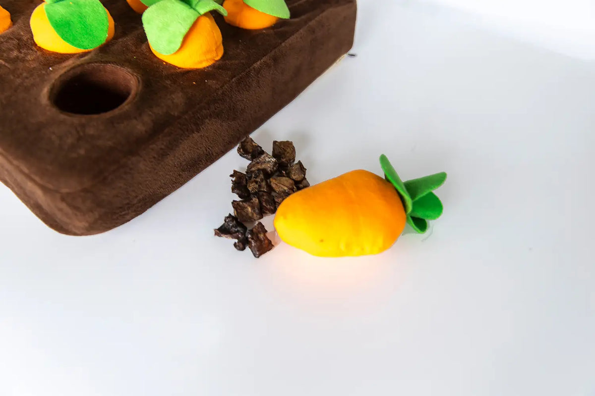 - Verstop brokjes of de favoriete snacks van je hond onder de wortels en laat enkele wortels buiten het veld.