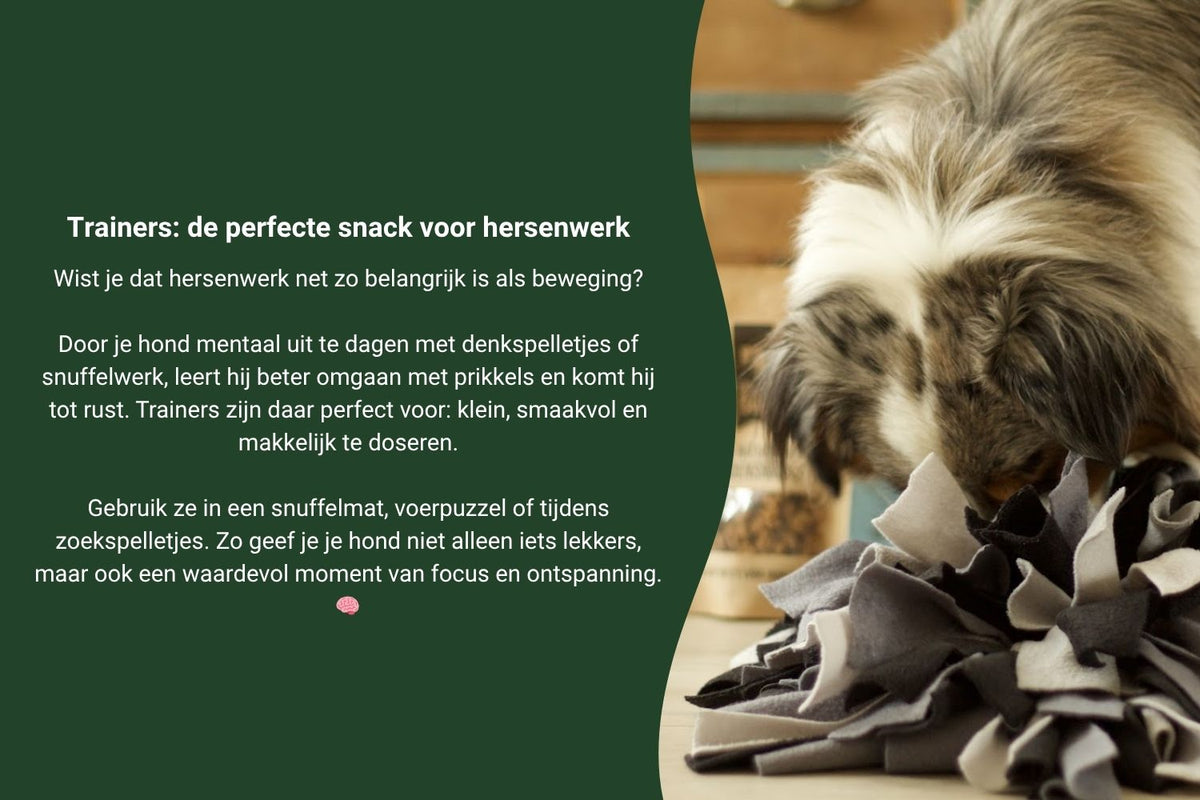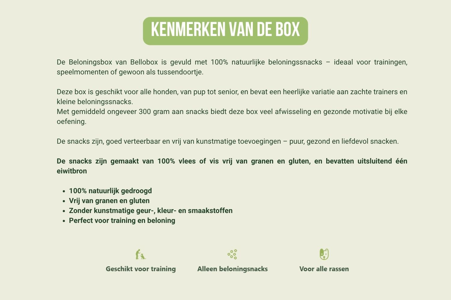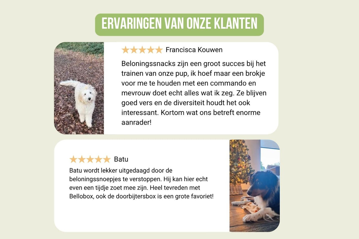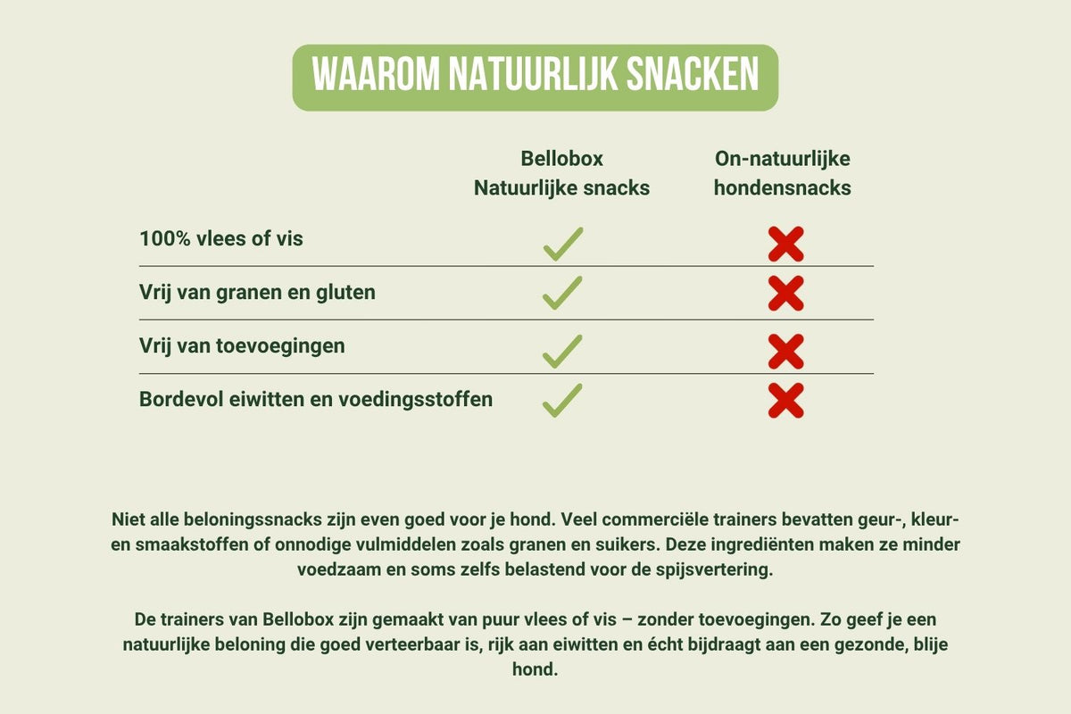De Bello’s Beloningsbox is een feestje voor elke hond! Of je nu een pup hebt of een senior, een kleintje of een grote knuffelbeer—deze box zit boordevol 100% natuurlijke beloningssnacks. Perfect voor tijdens het trainen, als tussendoortje of om te verstoppen in een snuffelmat.