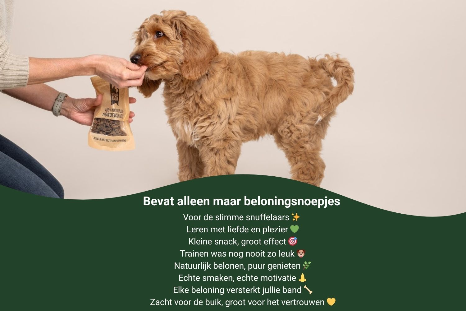De inhoud varieert per box en is zorgvuldig samengesteld met de lekkerste beloningssnacks.