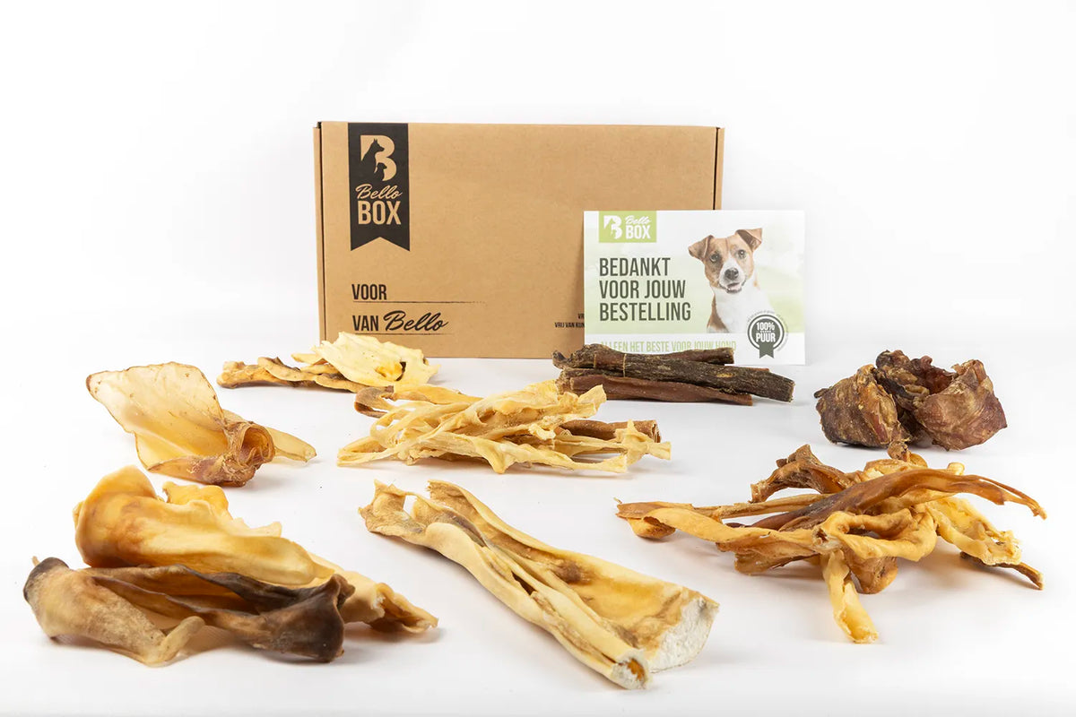 Onze Doorbijtersbox Small is uitsluitend samengesteld uit kauwsnacks van middelklein formaat, zonder toevoeging van zachte snacks of trainers. Elke snack is 100% natuurlijk en vrij van kunstmatige geur-, kleur-, en smaakstoffen, en bevat geen granen of gluten, wat hen een gezonde keuze maakt voor jouw hond.