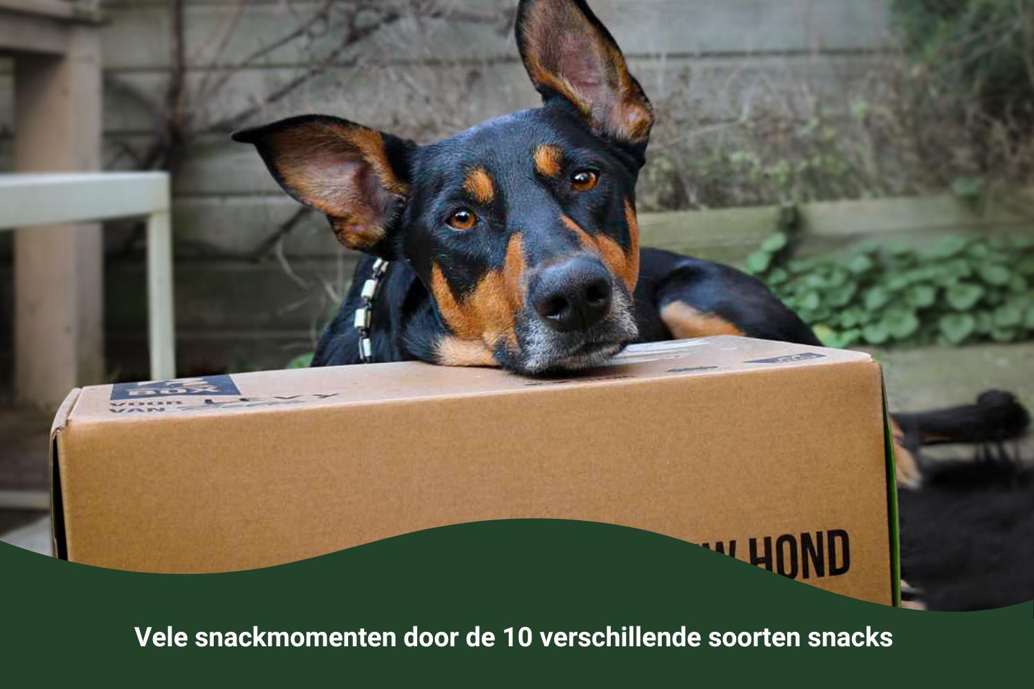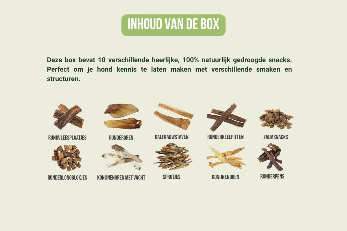 Perfect om kennis te maken met onze natuurlijke snacks. De box bevat 10 soorten verschillende snacks, met een mix van vis, vlees, beloningssnacks en kauwsnacks.