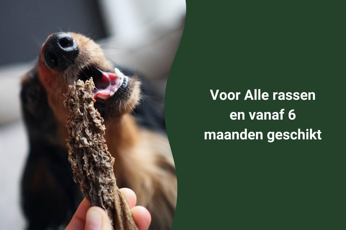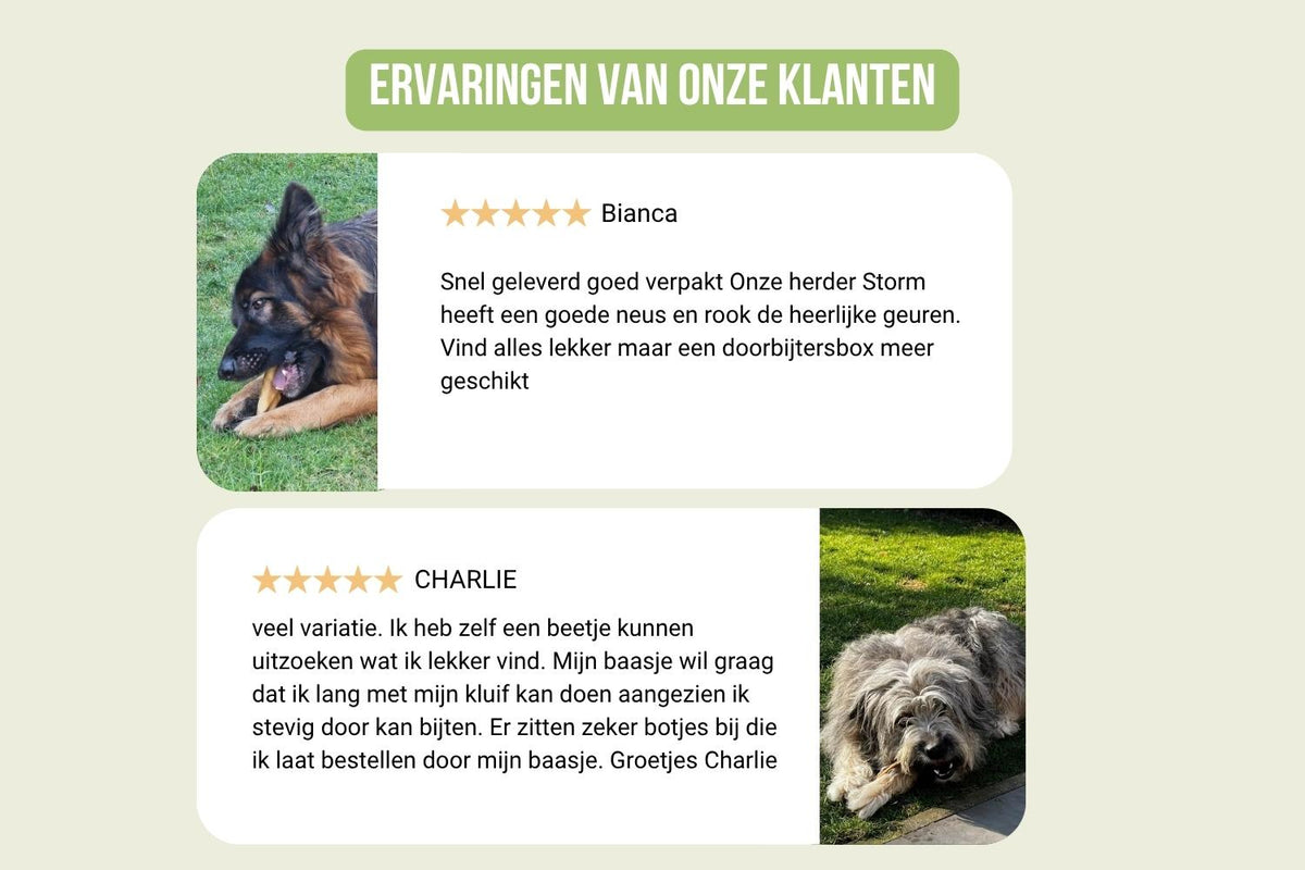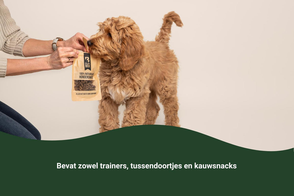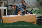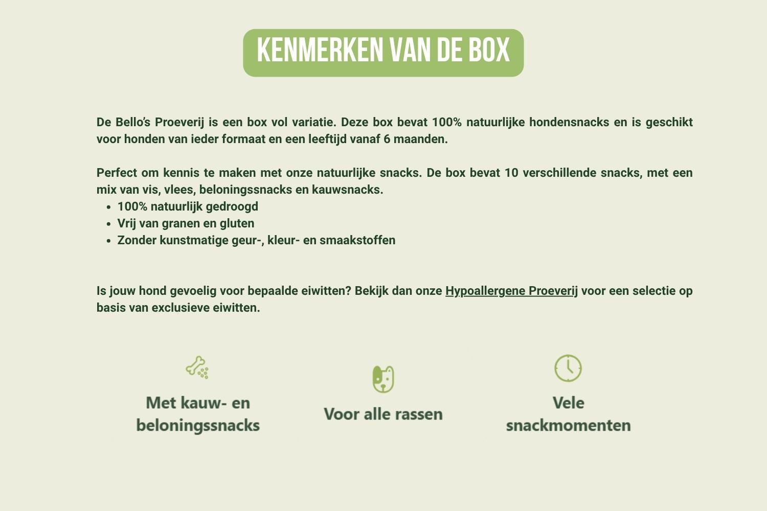 De Bello’s Proeverij is een box vol variatie. Deze box bevat 10 verschillende soorten 100% natuurlijke hondensnacks en is geschikt voor honden van ieder formaat en een leeftijd vanaf 6 maanden.