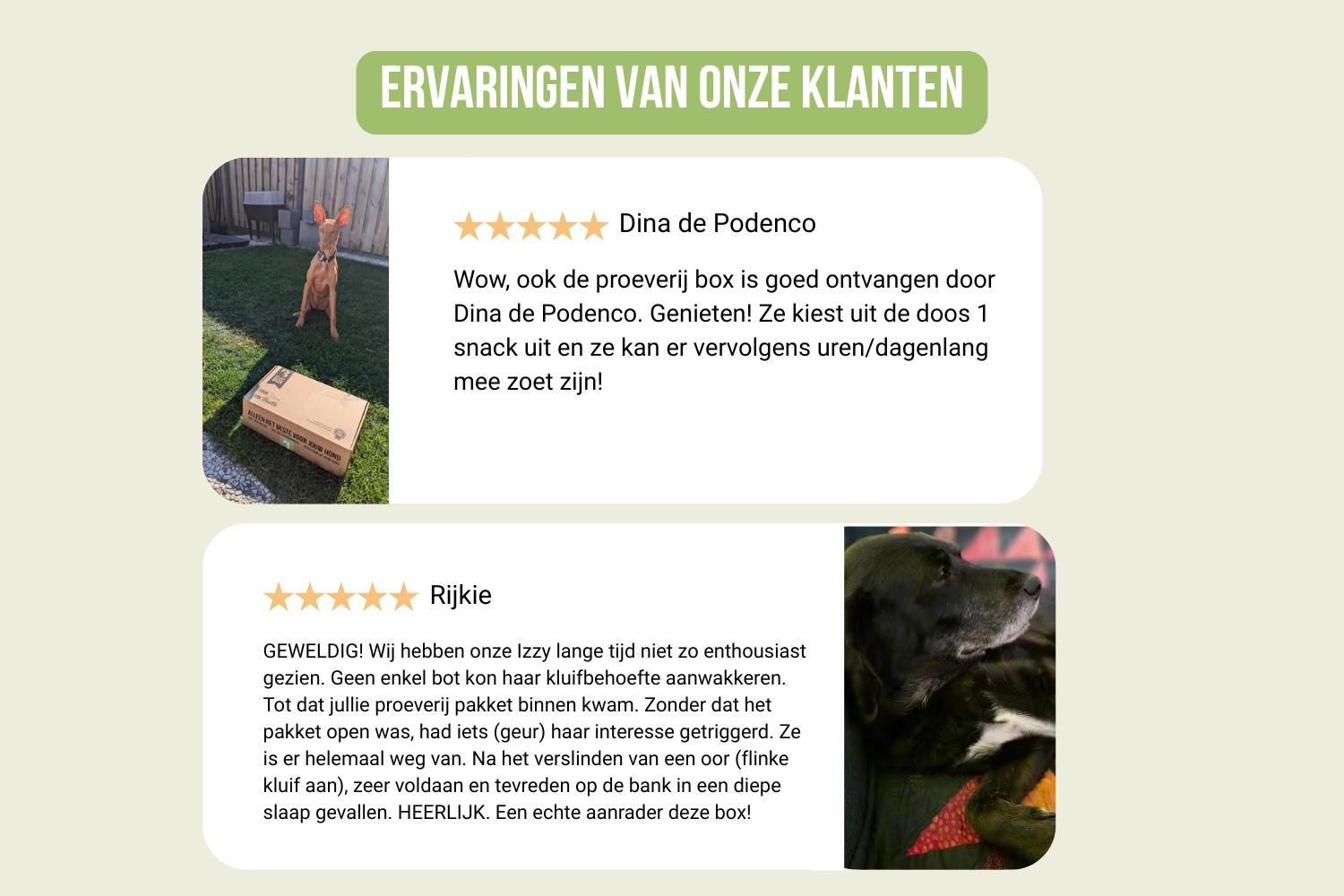 De proeverij is niet aan te passen aan speciale dieetwensen. Heeft jouw hond wel specifieke behoeften? Kies dan een van onze andere boxen en geef je wensen door in de opmerkingen van je winkelwagen. Wij zorgen voor een aangepaste box met liefde samengesteld.