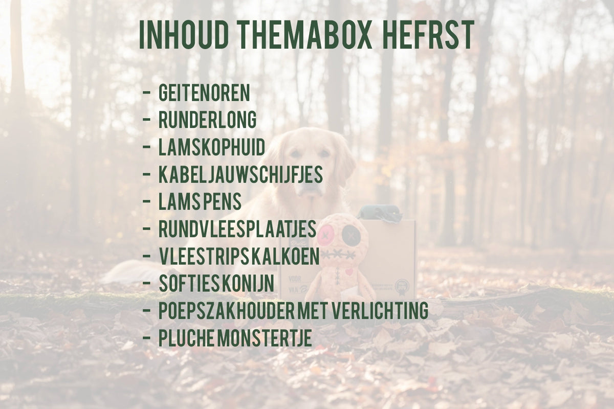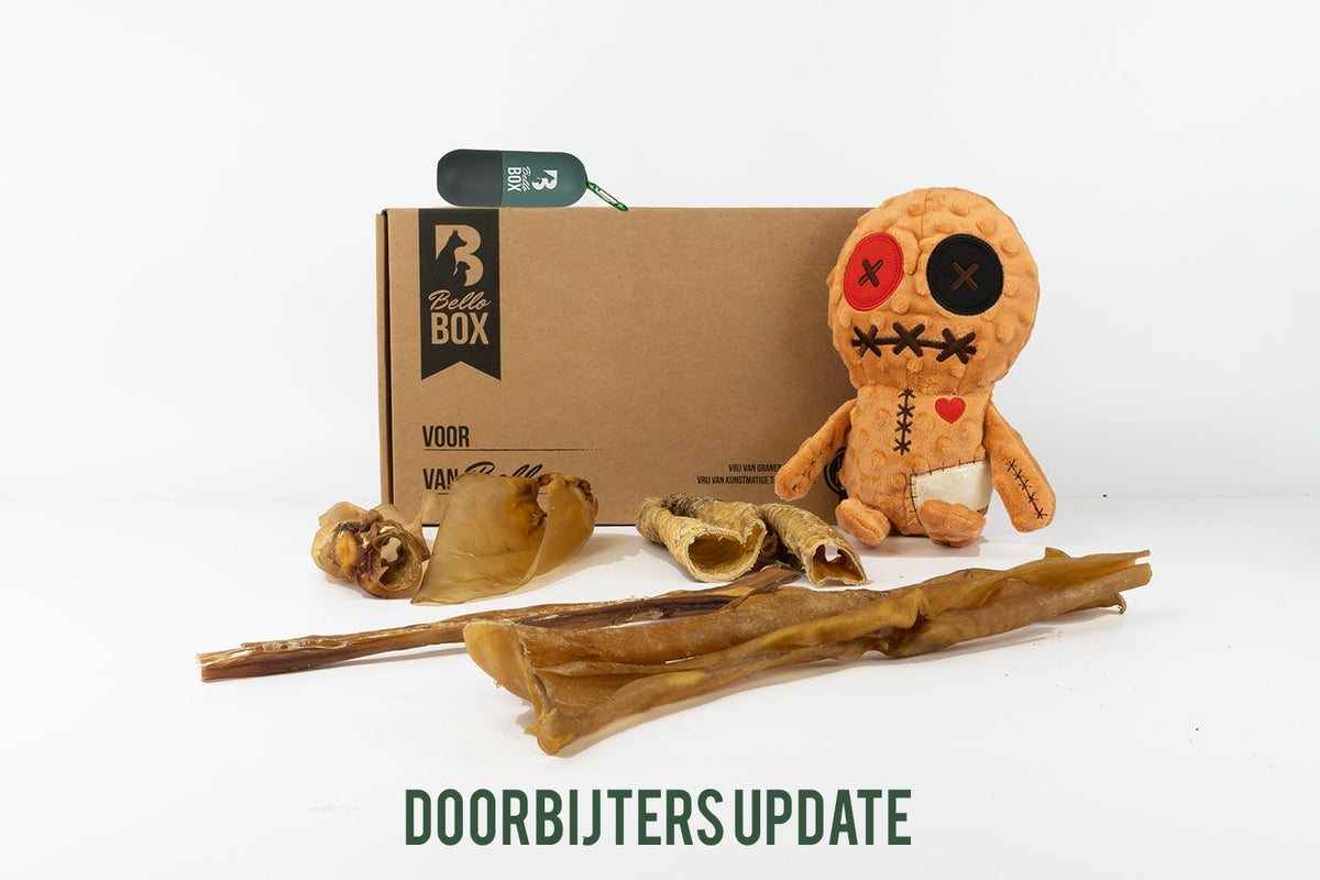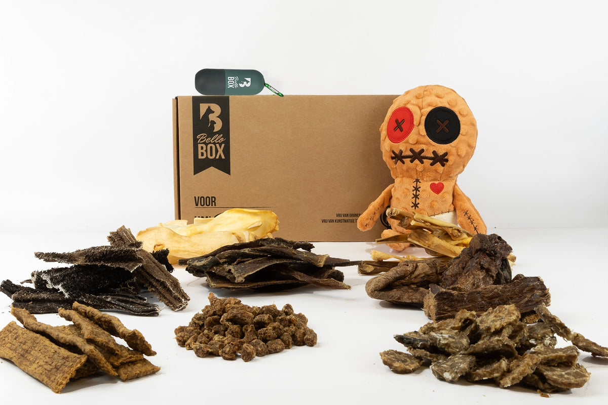 De box bevat (belonings)snacks en niet al te harde kauwproducten om het voor iedere hond leuk te houden. Wil je toch ook graag hardere kauwproducten in jouw box, dan kun je kiezen voor onze doorbijters variant. Liever een hypoallergene variant? Ook dat hebben we voor de Themabox mogelijk gemaakt.