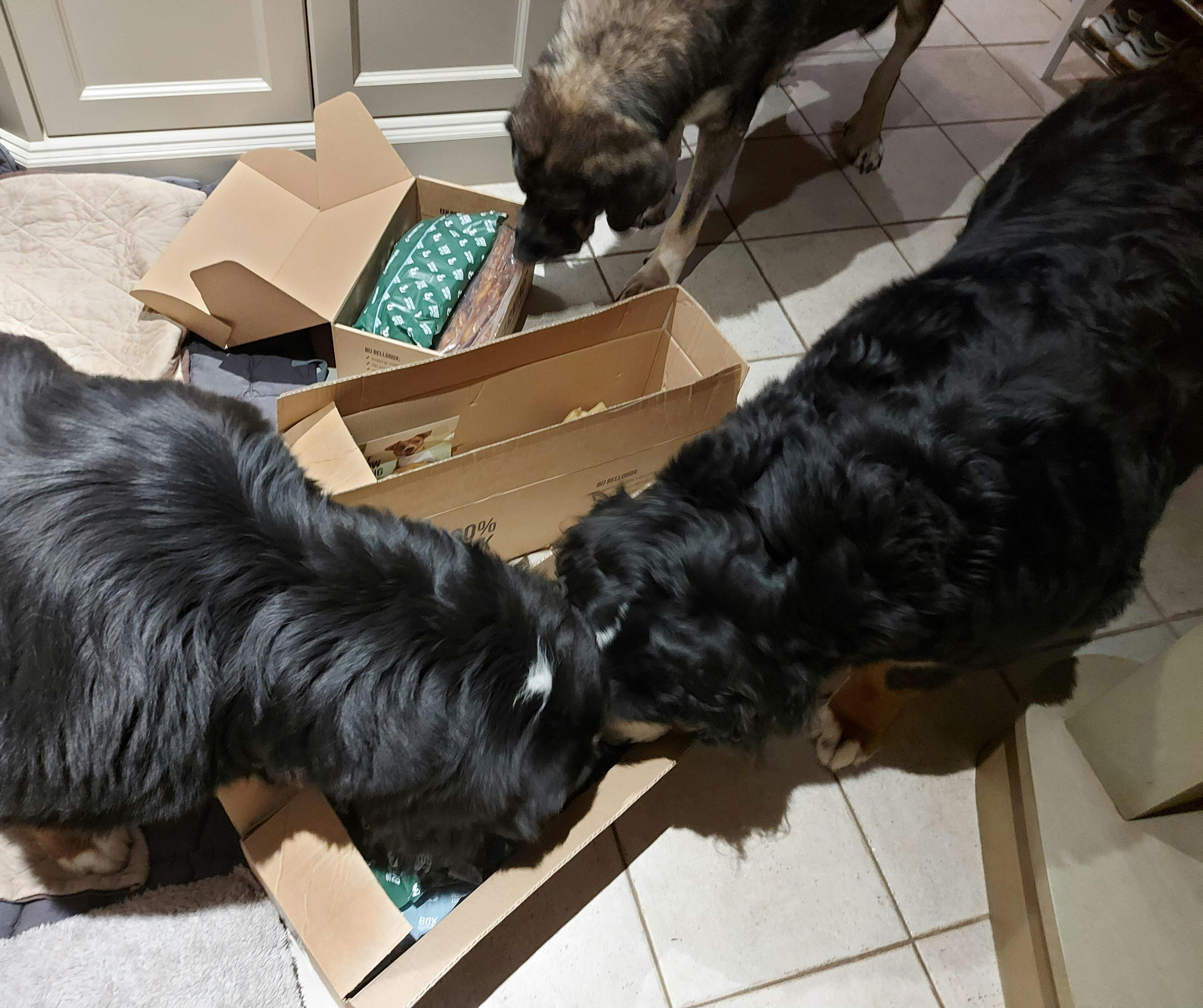 Voor onze 3 grote honden hebben wij 3 verschillende boxen aangekocht. En wat een festijn is het voor hen. Bij aankomst leek het alsof zij hun ogen en neus niet konden geloven 😅 Heel voorzichtig gingen zij met de neus in de doos, dan kijkend van... "echt voor ons". En dan werd het startschot gegeven. Elk had zijn keuze gemaakt. Er bleef uiteindelijk niks meer van hun lekkernij over. Nu moet ik maar "het pakje" vernoemen en zij staan klaar om te kiezen. Een echt festijn om dit te zien. Het maakt iedereen hier blij. Een heel goeie keuze dat vanaf nu herhaald zal worden.