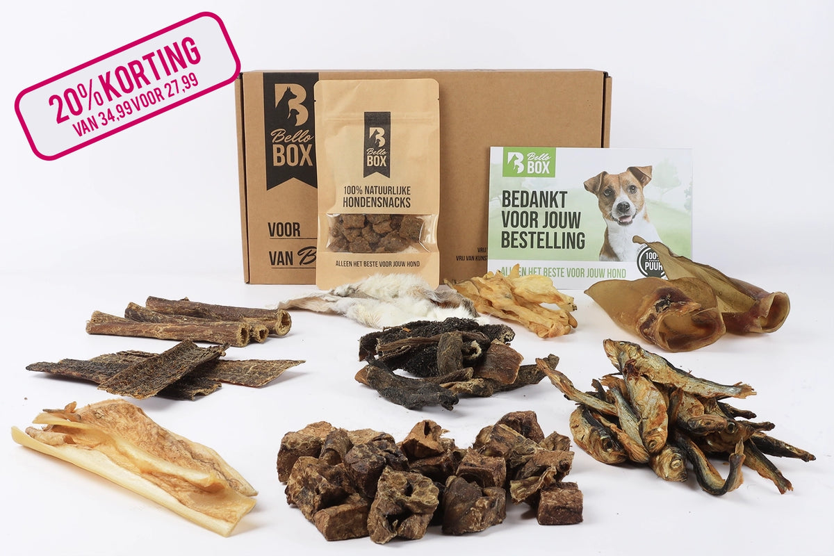 De proeverij is een box vol variatie. Deze box bevat 100% natuurlijke hondensnacks en is geschikt voor honden van ieder formaat en een leeftijd vanaf 6 maanden.