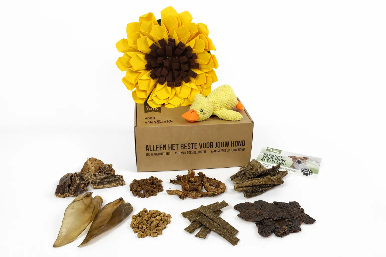 De box bevat een gevarieerde mix van beloningssnacks en niet al te harde kauwproducten, zodat hij voor veel honden geschikt is. Ook is er een hypoallergene variant beschikbaar.